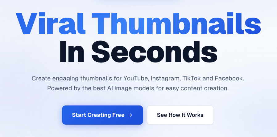 SkySnail generates high-performing thumbnails for YouTube, TikTok, Instagram, Facebook, and more. You can describe your video, upload a transcript, or just paste a YouTube link. In seconds, it spits out thumbnails designed to actually get clicks, using proven styles from top-performing creators.